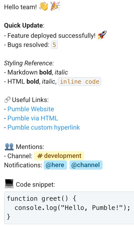 "text": "Hello team! :wave: :tada:\n\n**Quick Update**:\n- Feature deployed successfully! :rocket:\n- Bugs resolved: `5`\n\n*Styling Reference:*\n- Markdown **bold**, *italic*\n- HTML <b>bold<\/b>, <i>italic<\/i>, <code>inline code<\/code>\n\n\ud83d\udd17 Useful Links:\n- [Pumble Website](https:\/\/pumble.com)\n- <a href=\"https:\/\/pumble.com\">Pumble via HTML<\/a>\n- <https:> \n\n:busts_in_silhouette: Mentions:\n- Channel: <<#{{68e3a383ce5f2c8d95ff46a6}}>> \nNotifications: @here @channel \n\n:computer: Code snippet:```function greet() {\n console.log(\"Hello, Pumble!\");\n}```"