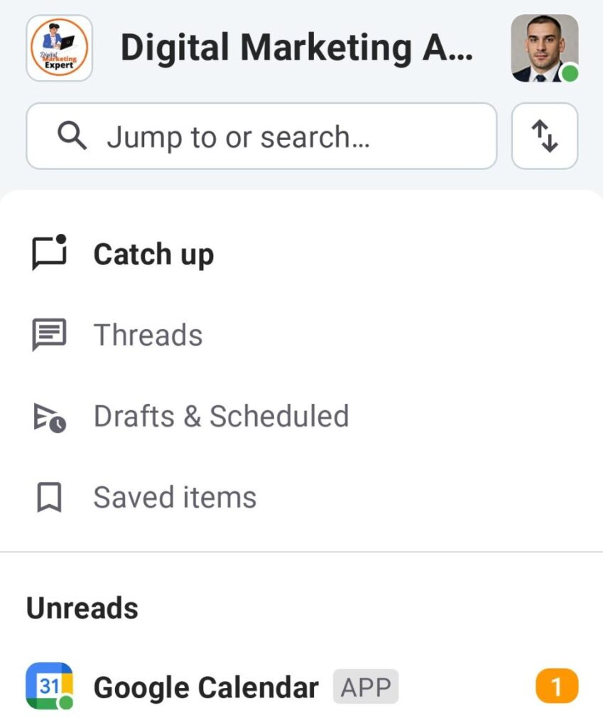 In der Web-App werden Erwähnungen oder Ungelesen in der linken Seitenleiste angezeigt. Oben links kannst du sehen, ob die Nachricht in einer DM oder in Threads ist.