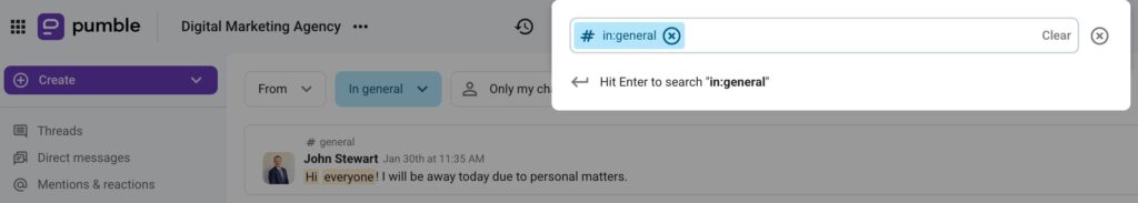 In einem Arbeitsbereich in Pumble kannst du den Unterhaltungsverlauf deines Teams durchsuchen, um die wichtigen Nachrichten, die du benötigst, zu finden.