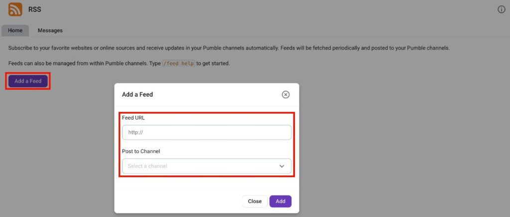 - Escribe /feed subscribe en el editor de texto de un canal público o privado