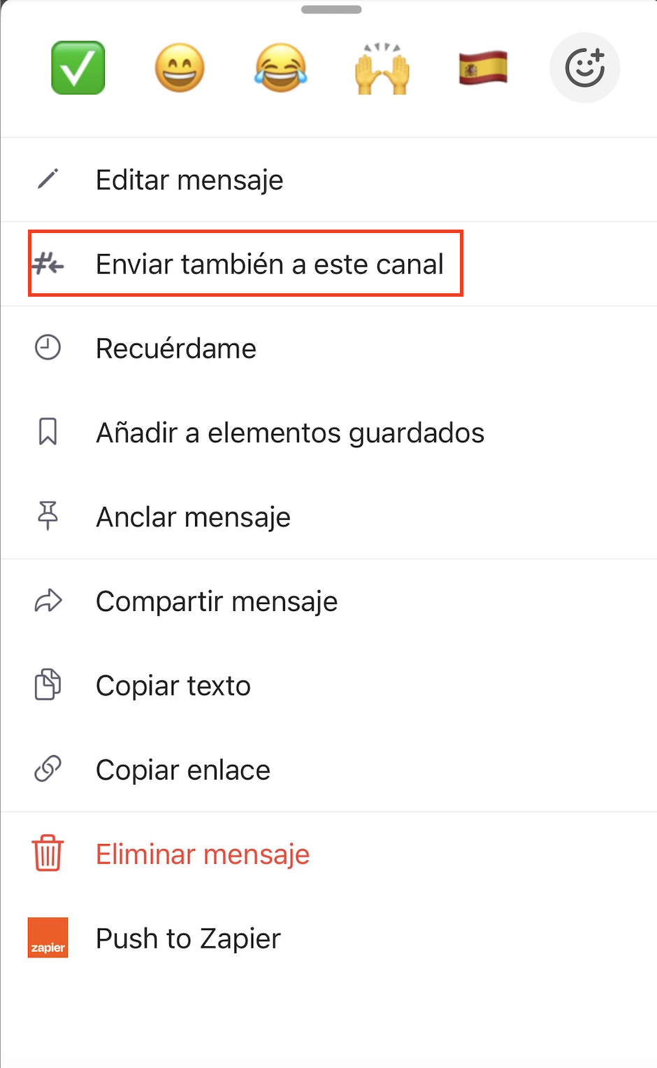 - Para enviar tu respuesta al canal o a la vista principal de mensajes directos, simplemente marca la casilla de verificación de Enviar también a [nombre del canal] ubicada encima de tu mensaje
