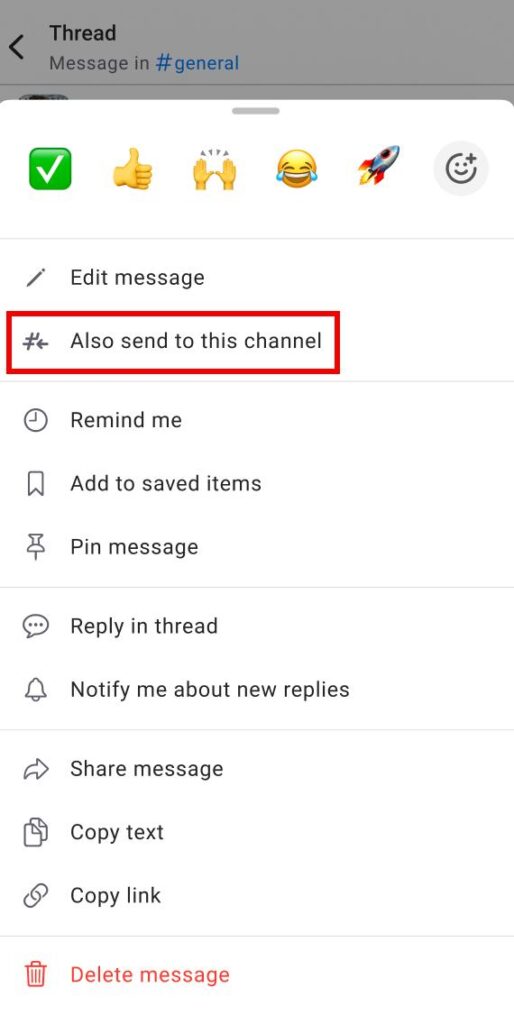 You can send a thread message to a wider channel to notify all other users. To do this, simply check the Also send to #channel checkbox before sending the message. Moreover, you can do this retroactively by following these steps: