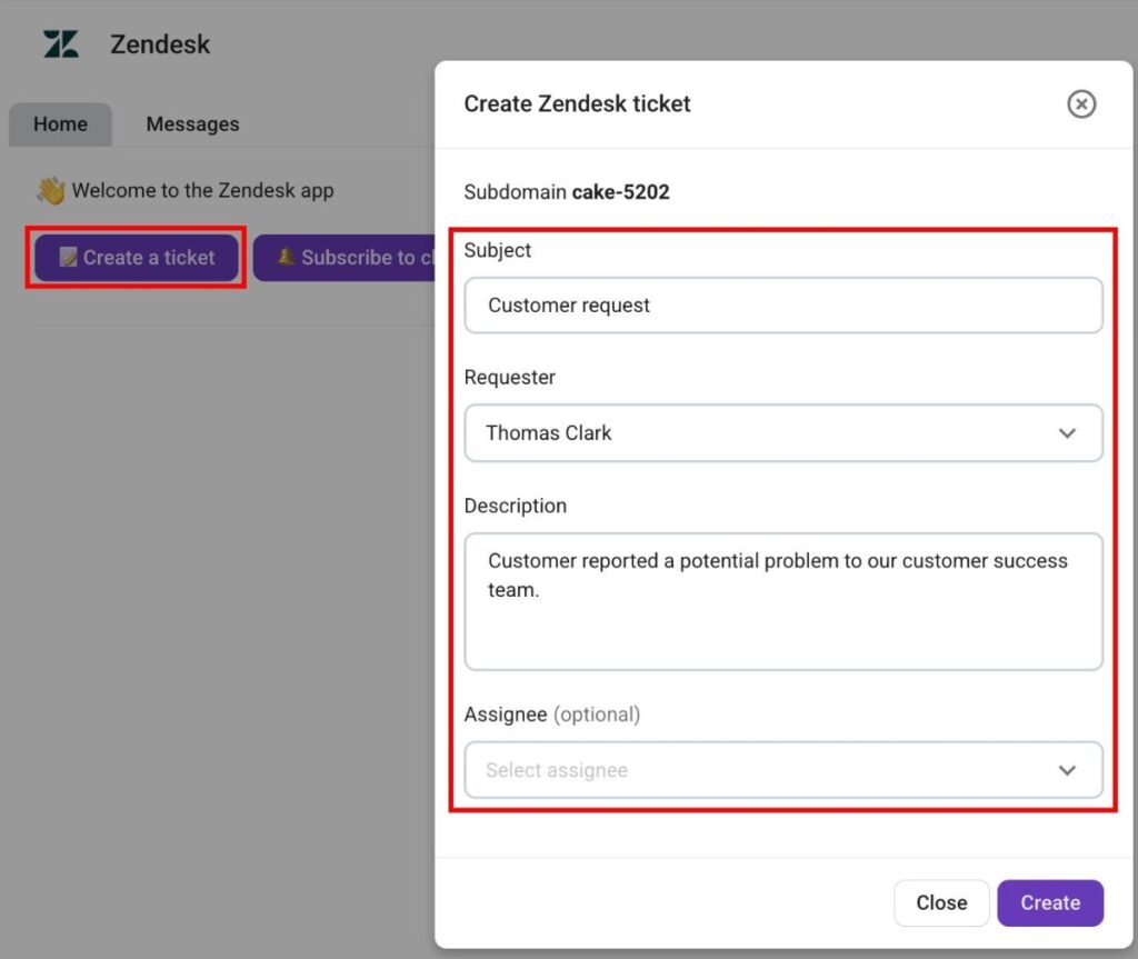 Pumble allows you to create Zendesk tickets directly from the addon. Here’s how you can do it: