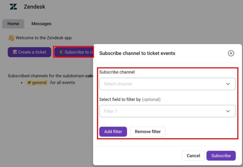 • /zendesk subscribe {field1=value1; field2=value2} — subscribes the current channel to Zendesk updates.