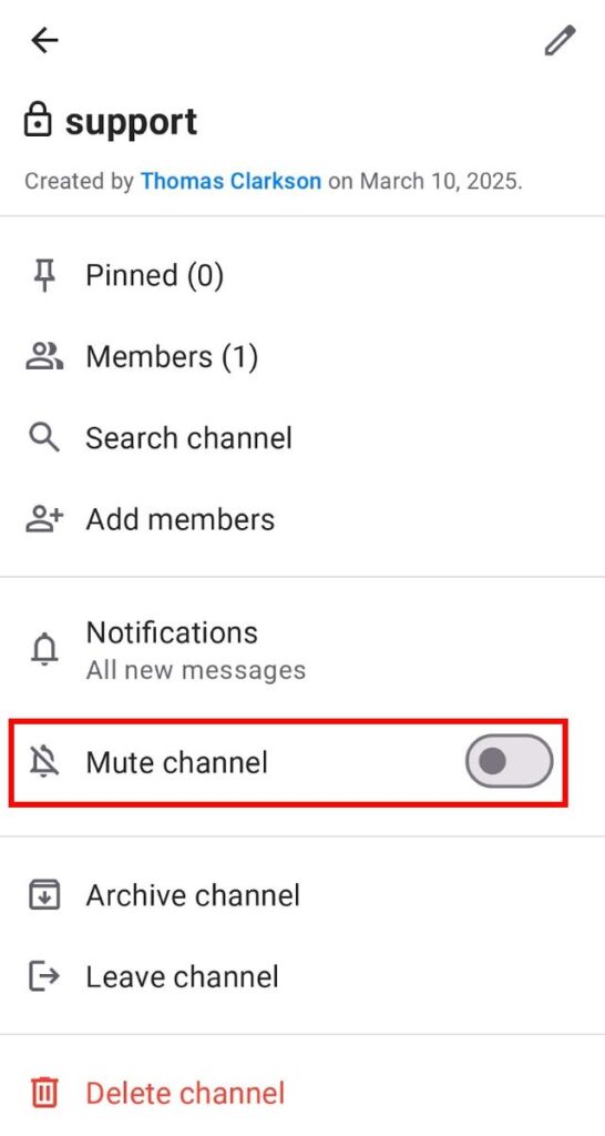 3. Clique em Silenciar canal/Silenciar conversa