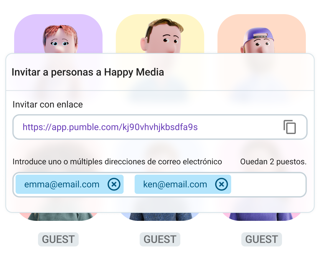 Así, en lugar de inundarlos de correos electrónicos o darles acceso completo a tu espacio de trabajo, puedes invitarlos como invitados multicanal en Pumble.