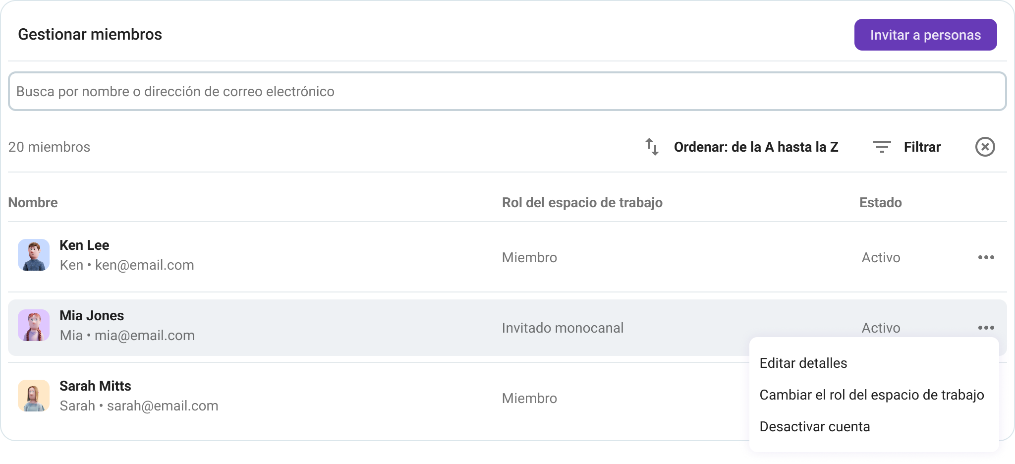 Con solo unos clics, puedes ver quién tiene acceso a qué canales, actualizar permisos a medida que evolucionan los proyectos o desactivar usuarios al finalizar las colaboraciones.