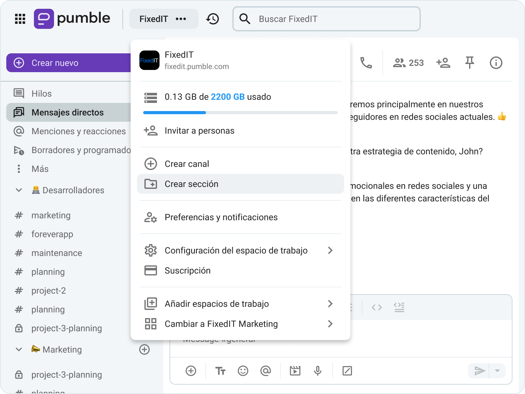 Por ejemplo, una agencia de marketing que trabaja en el lanzamiento de un producto podría añadir a su cliente como invitado a uno de los canales del proyecto. De esta manera, el cliente ve todas las actualizaciones de progreso, borradores creativos y cronogramas sin acceder a los canales internos de la agencia para otros clientes. El acceso de invitado, en este caso, mantiene la comunicación profesional y segura, a la vez que le da al cliente la seguridad de estar completamente informado.