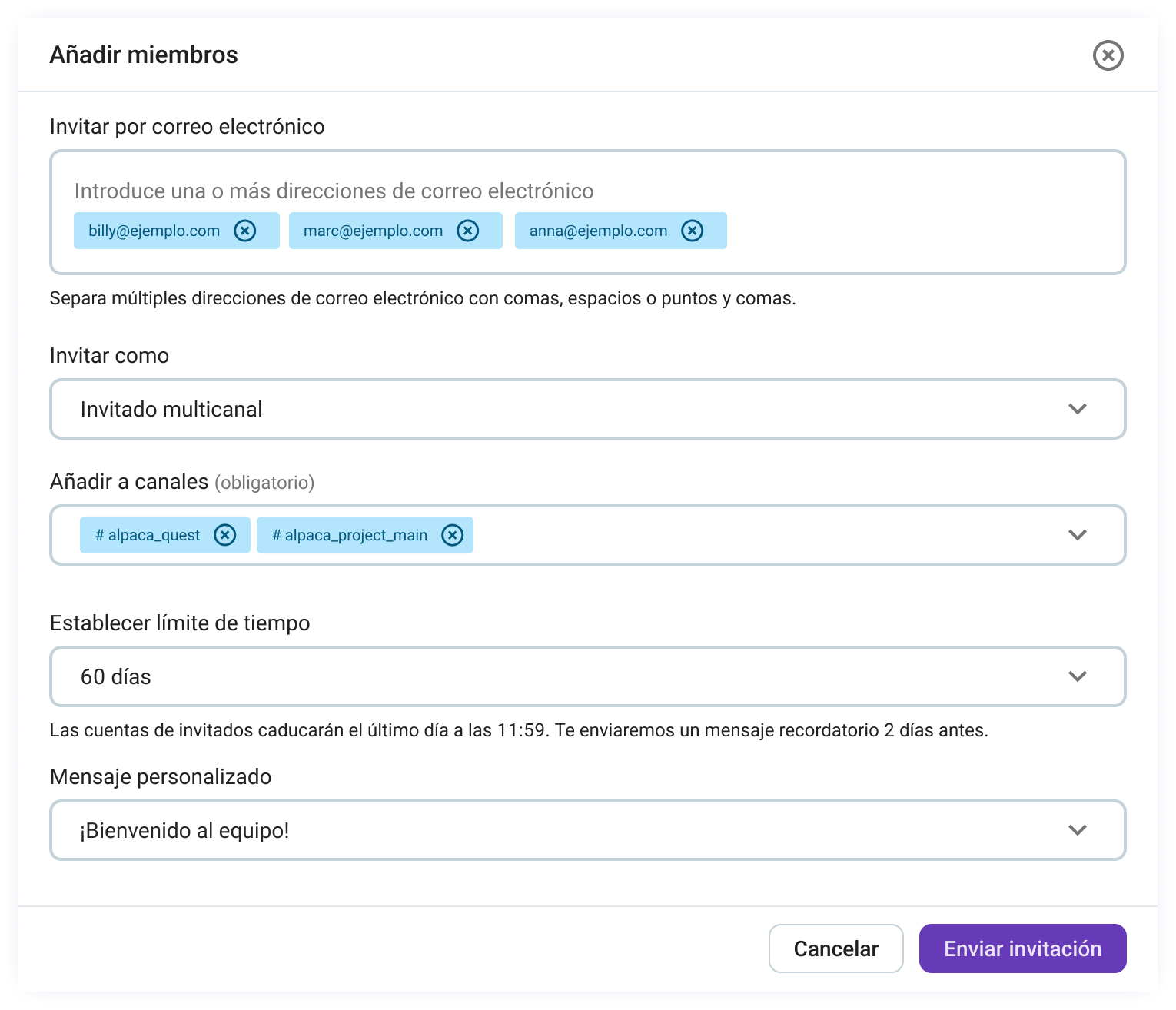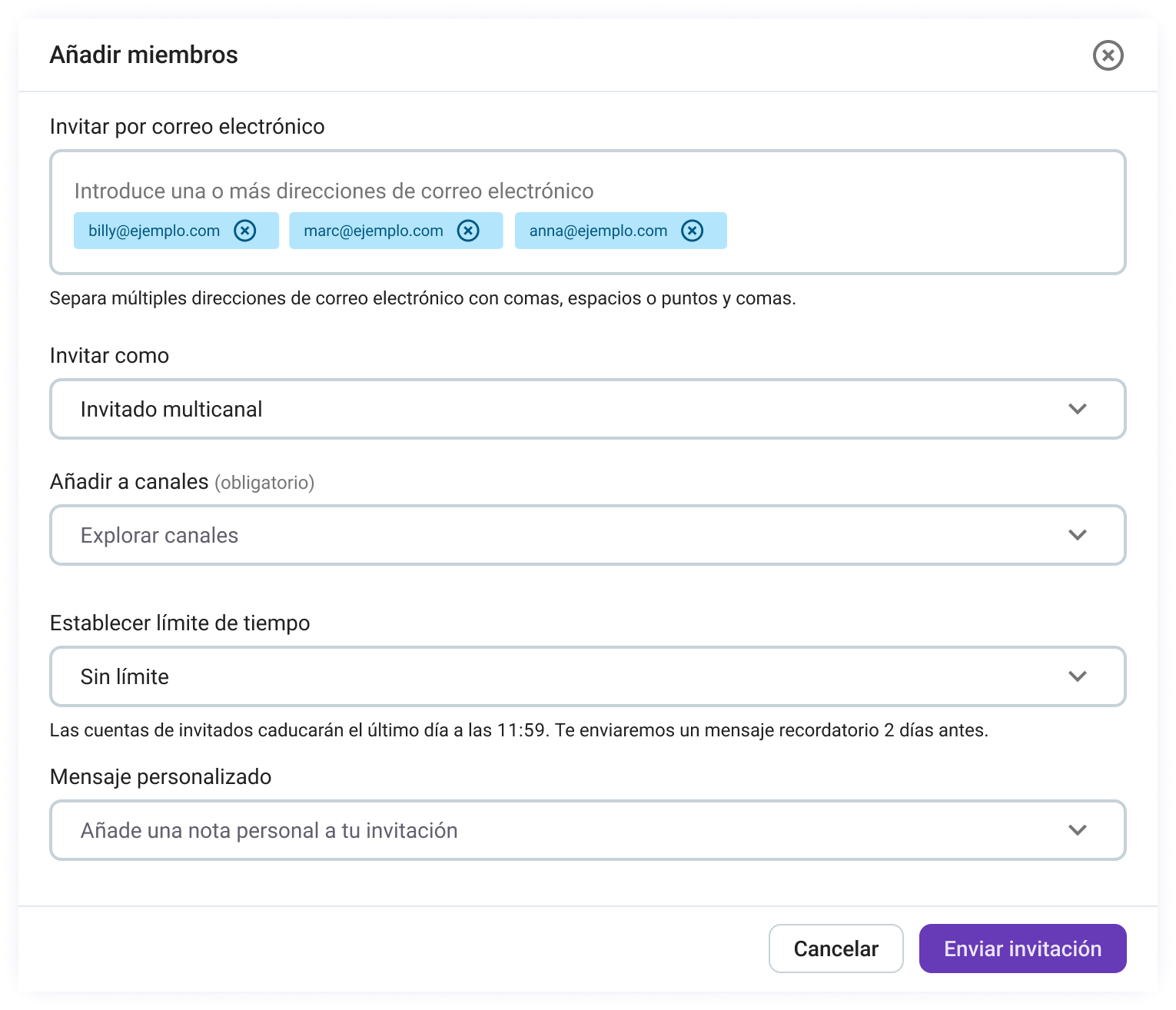 - Los canales específicos a los que pertenecen los usuarios invitados,