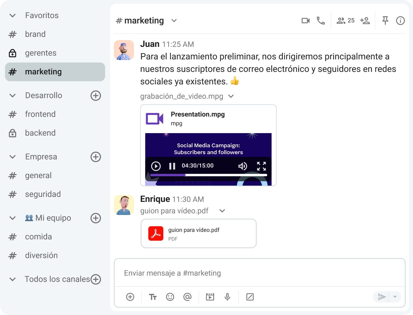 Imagina que tu equipo de diseño comparte un nuevo concepto de campaña. Con la integración de Google Drive, los archivos PDF se almacenan en el canal #campañas_marketing. Los comentarios se mantienen adjuntos, por lo que la evolución completa de los archivos se mantiene clara meses o incluso años después.