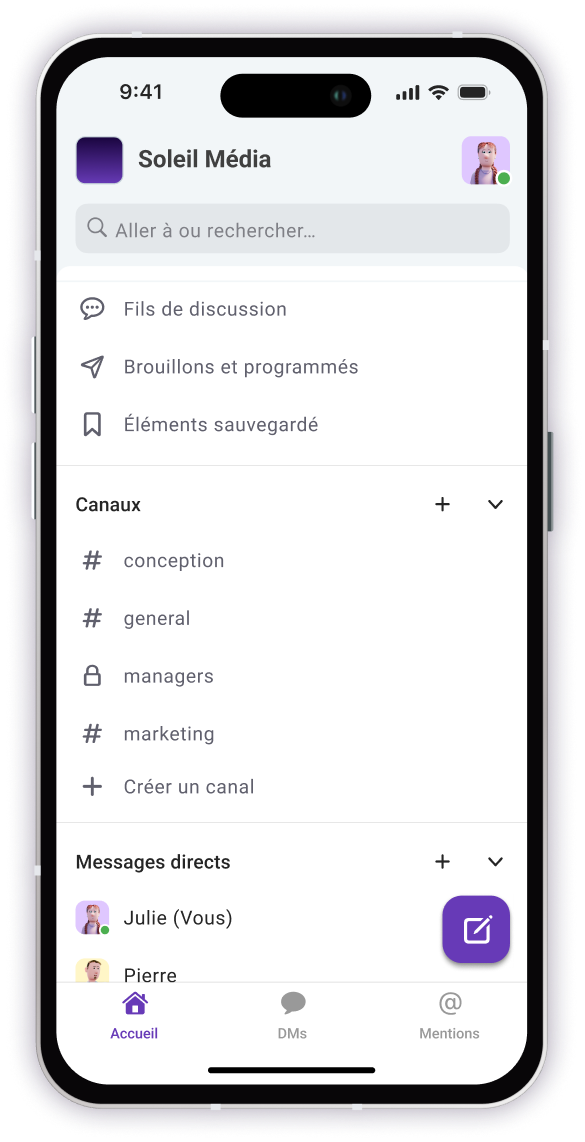 L'une des plus grandes frustrations des applications mobiles est la navigation complexe. Pumble vous offre une interface claire et intuitive, naturelle même sur un petit écran.