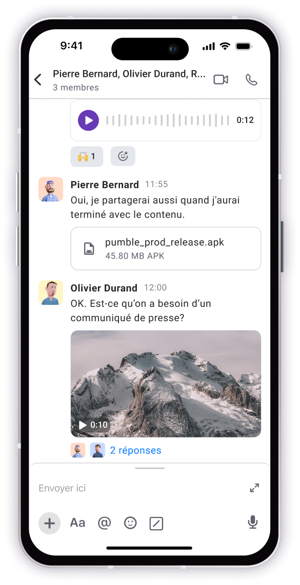 Saisir de longues mises à jour sur un téléphone peut être fastidieux, mais Pumble offre de multiples options de communication conçues pour les utilisateurs mobiles en déplacement :