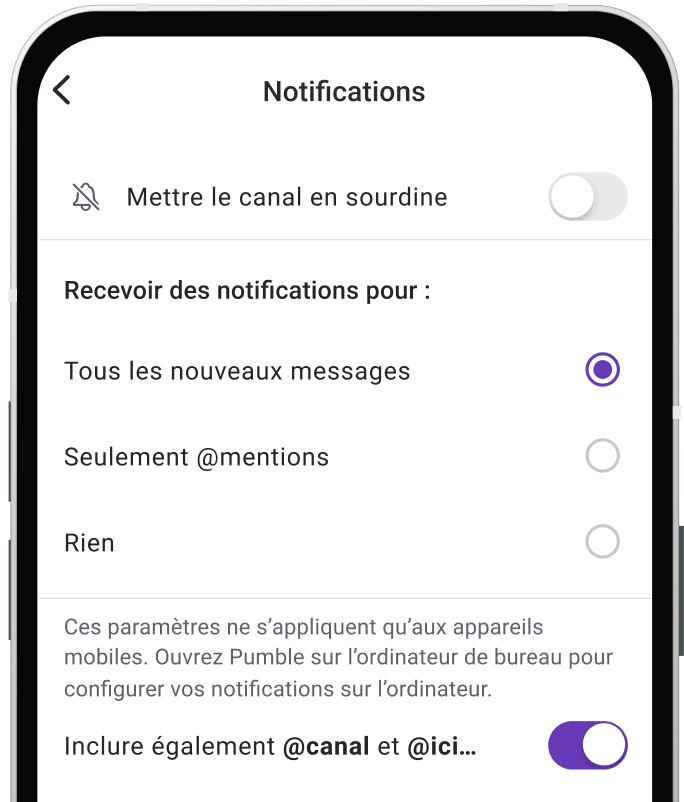 L'une des fonctionnalités les plus puissantes de l'application mobile Pumble est la possibilité de personnaliser le mode et le moment de réception des notifications. Vous pouvez gérer et paramétrer les notifications par canal, afin de ne recevoir des alertes que lorsque cela est nécessaire.
