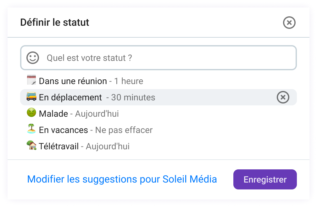 Les statuts sur mobile vous permettent d'indiquer votre disponibilité sans paroles. Vous pouvez utiliser les options intégrées comme Dans une réunion, En déplacement, Malade, Pause repas, En vacances, ou créer le vôtre et l'agrémenter d'un emoji.
