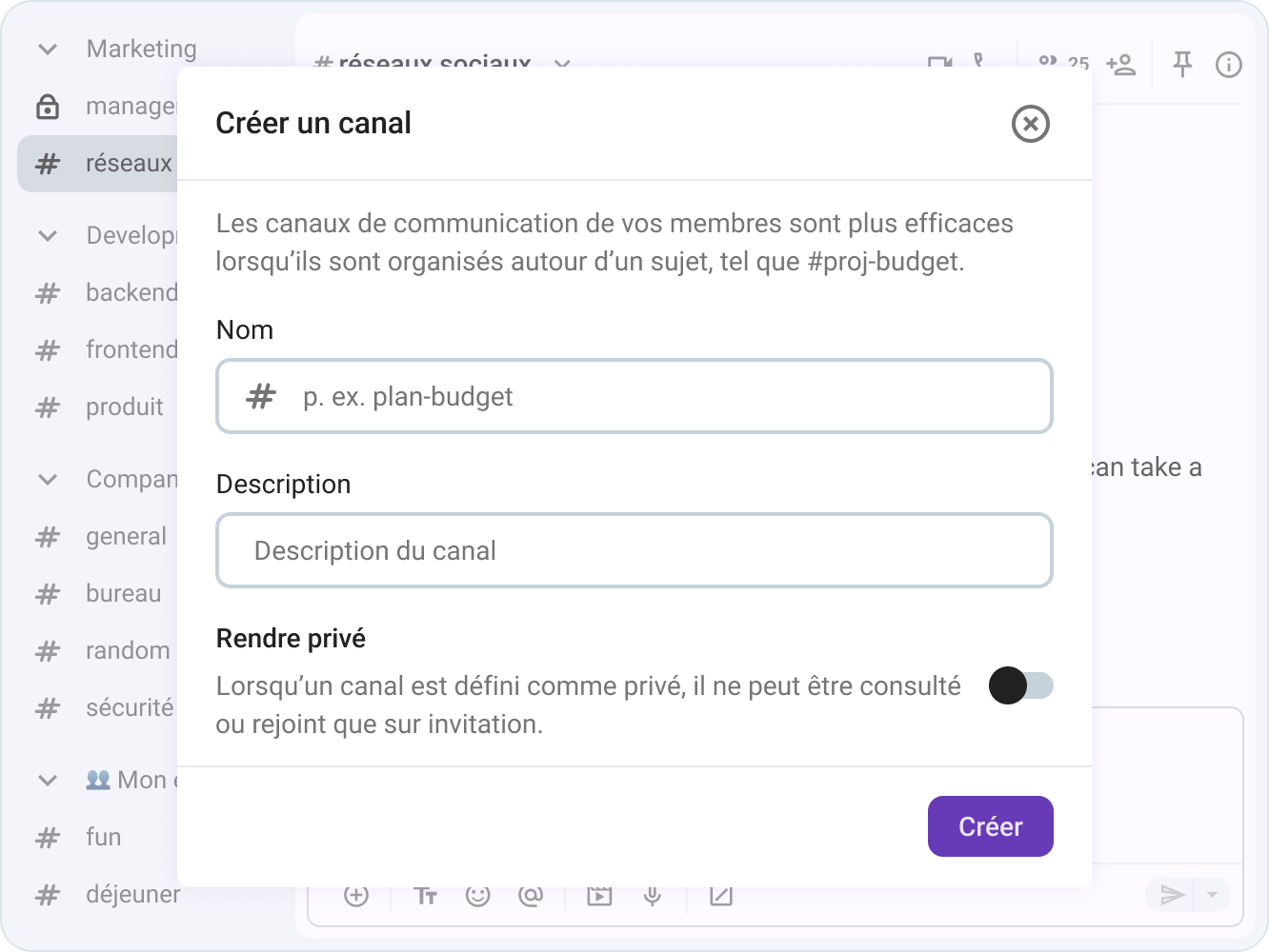 Les canaux sont l'espace où la communication de votre équipe passe et la meilleure façon d'éviter les fils de discussion email désordonnés. Chaque canal est dédié à un sujet, une équipe ou un projet, ce qui permet de garder les discussions organisées et faciles à retrouver.