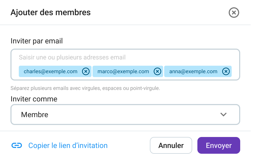 Pour inviter via un lien de partage, il n'est pas nécessaire de saisir les adresses email. Il suffit de cliquer sur Copier le lien d'invitation et de le partager via n'importe quelle plateforme ou application de messagerie instantanée.