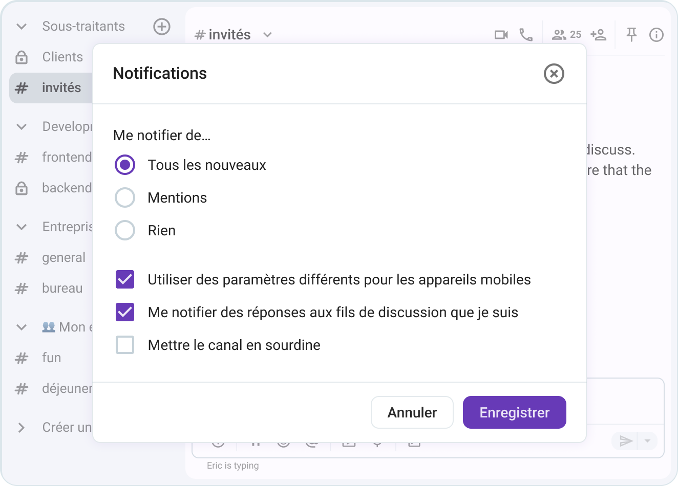 Lorsque les notifications sont correctement configurées, vous ne manquerez jamais les messages directs et les mentions importantes, tout en évitant la surcharge de notifications. Ceci est particulièrement utile pour les grandes équipes où l'activité des messages est élevée, ou pour les utilisateurs qui alternent entre l'application de bureau et l'application mobile.