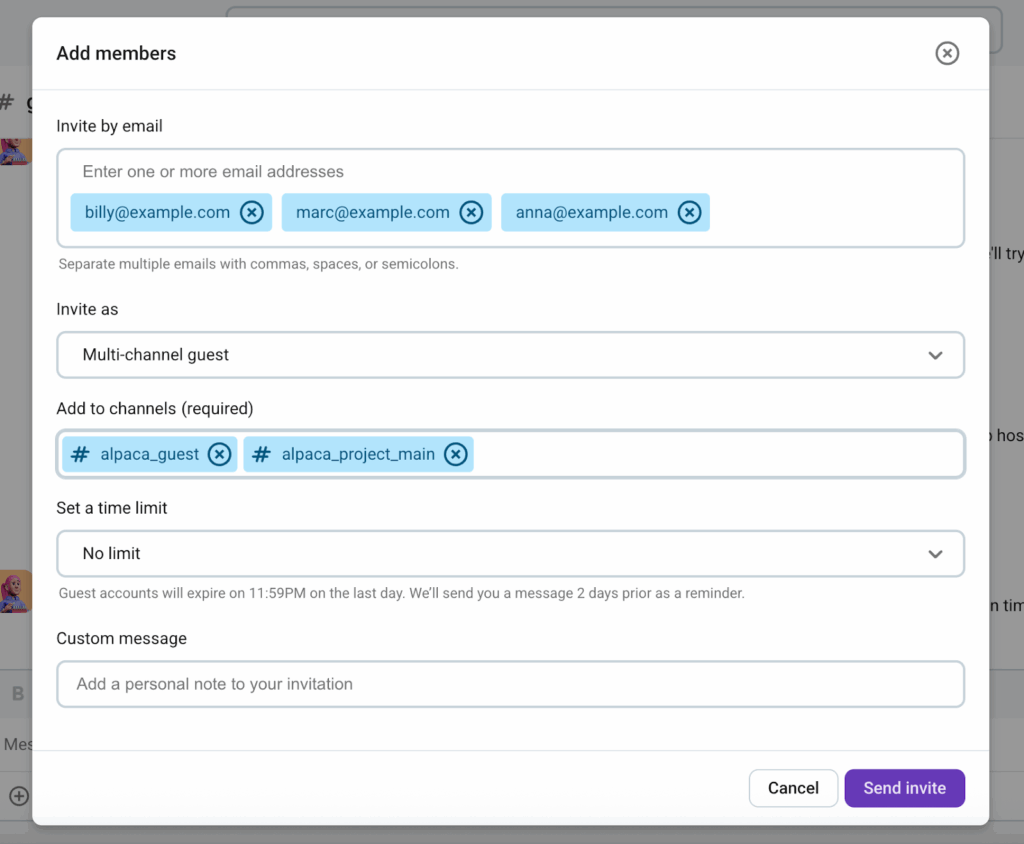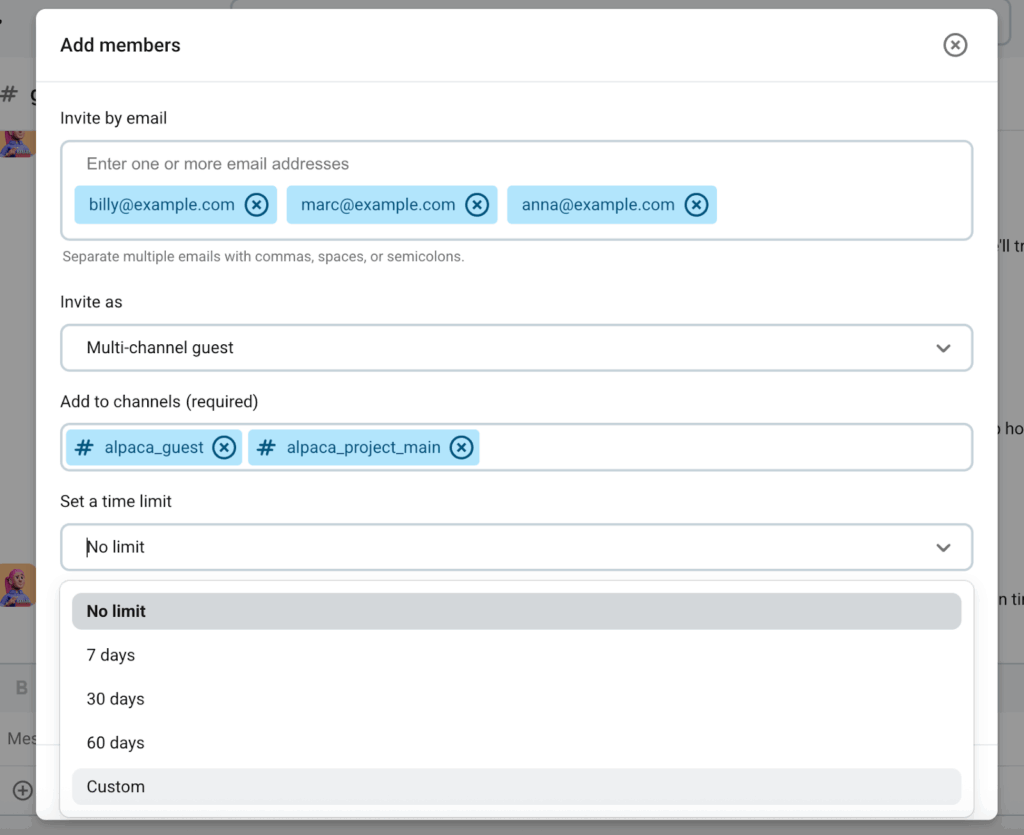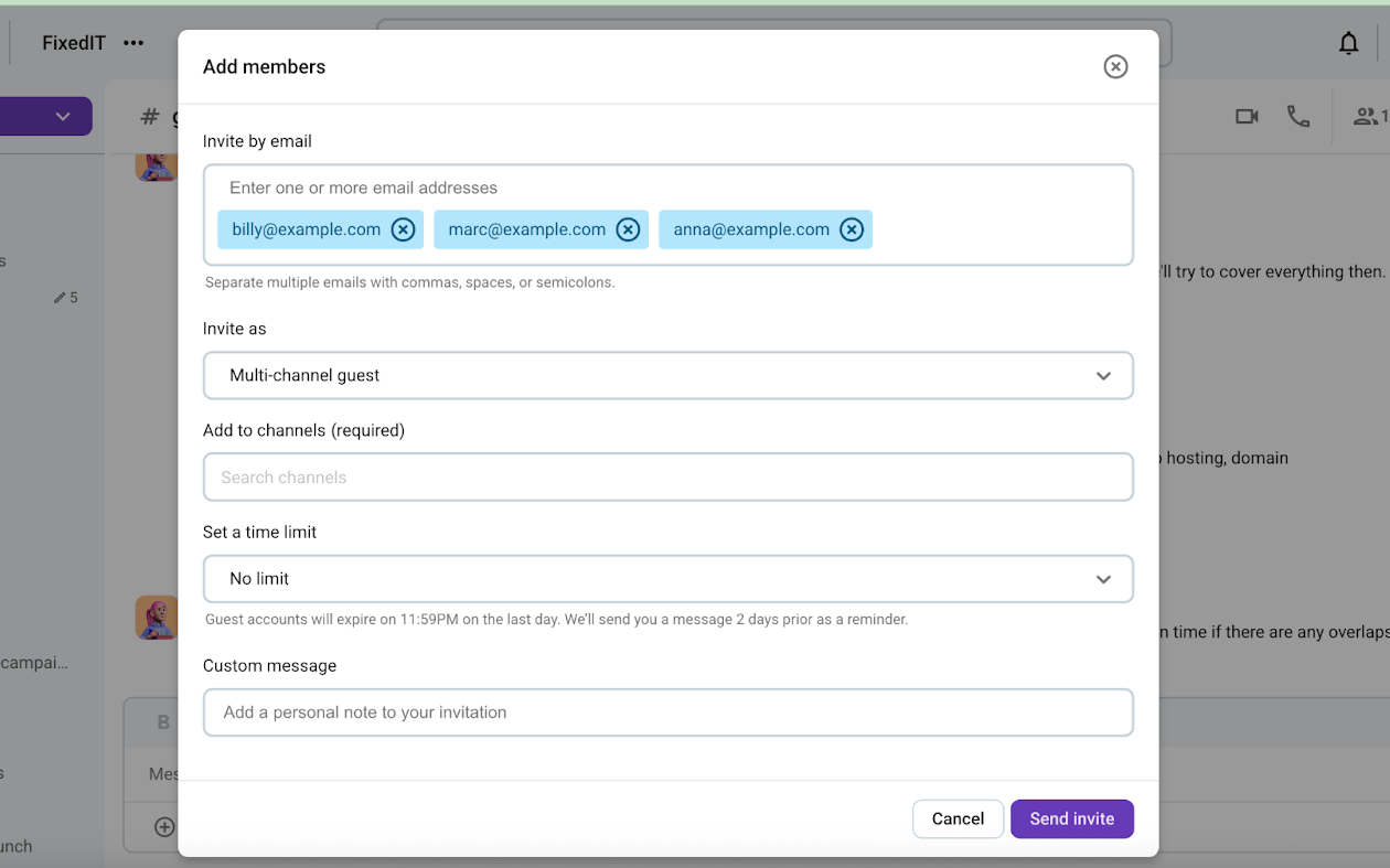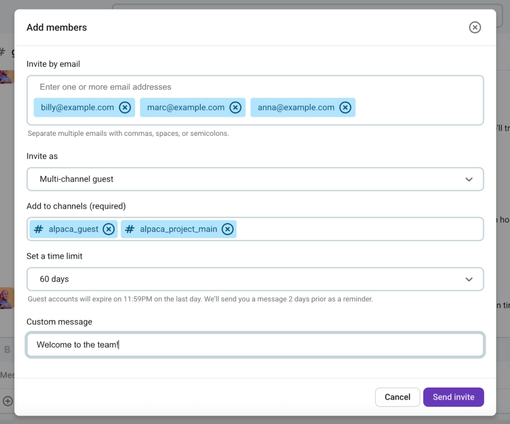 For instance, say your company hires a legal consultant to review compliance documentation. You can invite them as a single-channel guest into #legal-review, upload all the relevant files, and discuss directly inside the channel. You can also set their access to automatically expire after 30 days, so you don’t worry about removing them later.
