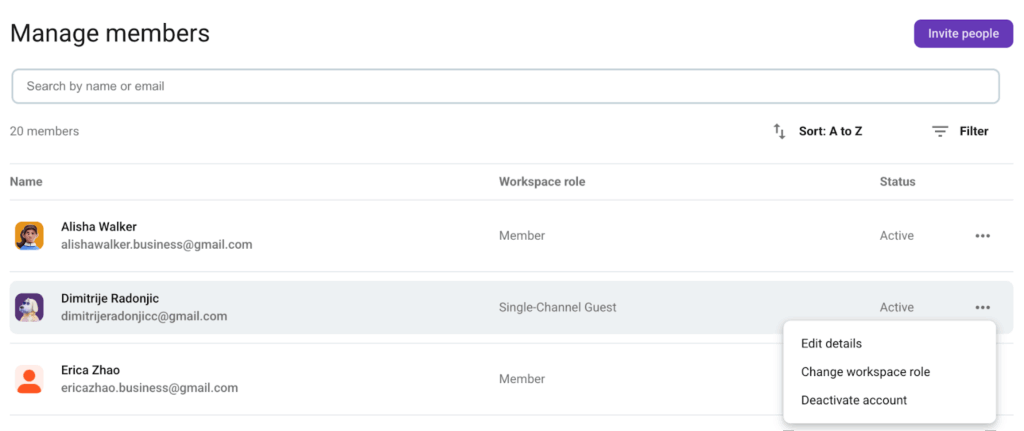 Start by navigating to Workspace settings, and select Manage members. Here, you can view a complete list of everyone in your workspace, internal members and external guests.