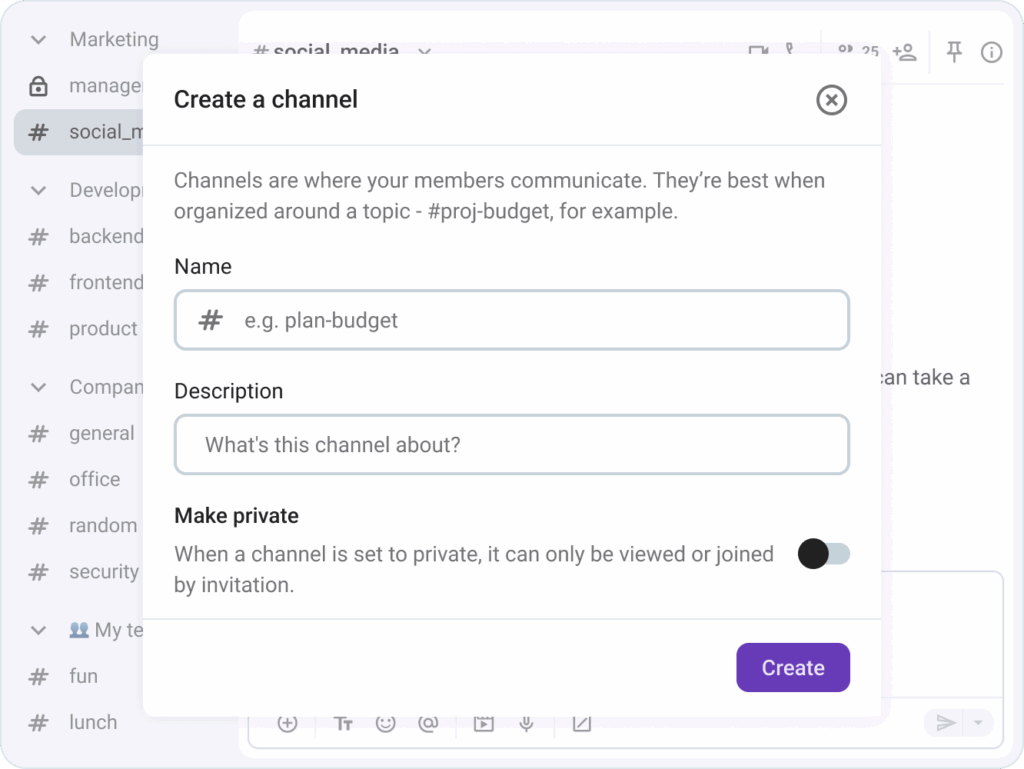All of these methods will open the same modal for creating channels. There you’ll have to add a name of the channel, choose if it’ll be private or public, and add a description, so everyone knows what it’s about.