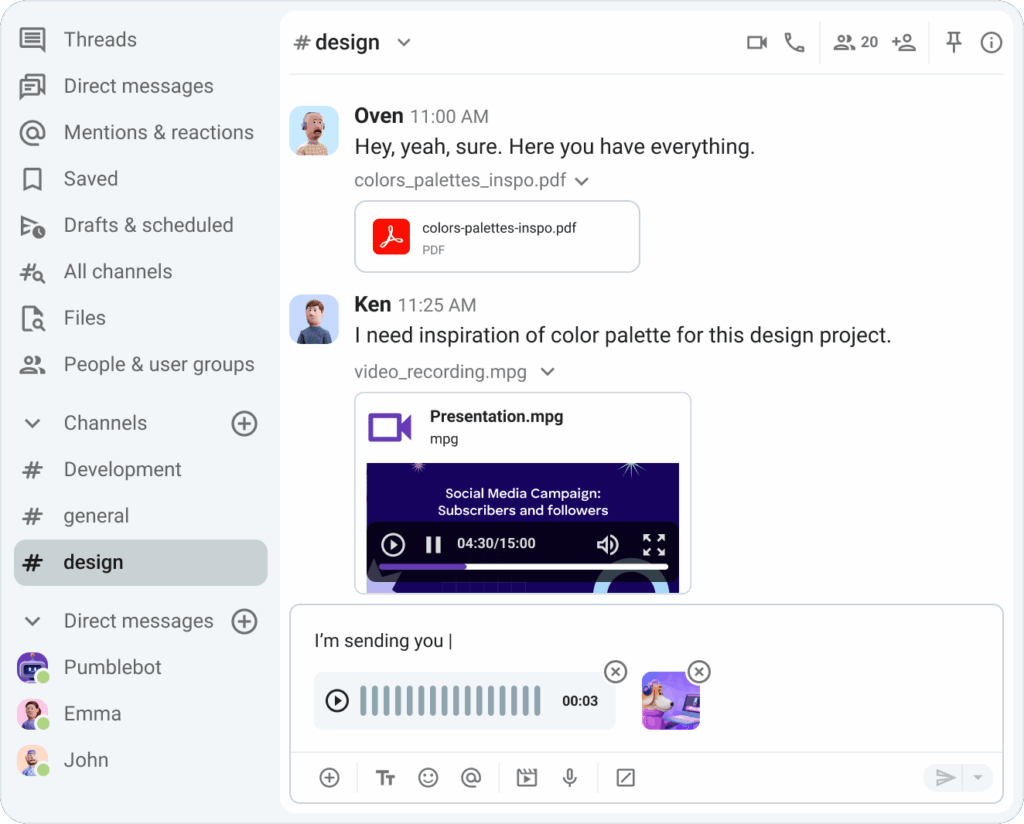 Every team relies on sharing documents, images, or resources, and doing it directly in Pumble keeps your workflow seamless. Instead of switching between apps or digging through emails, you can upload files right where the conversation happens.When you share a file in Pumble, it’s automatically stored and searchable within your channel or direct message. That means no more losing track of attachments or searching multiple folders for the latest version.